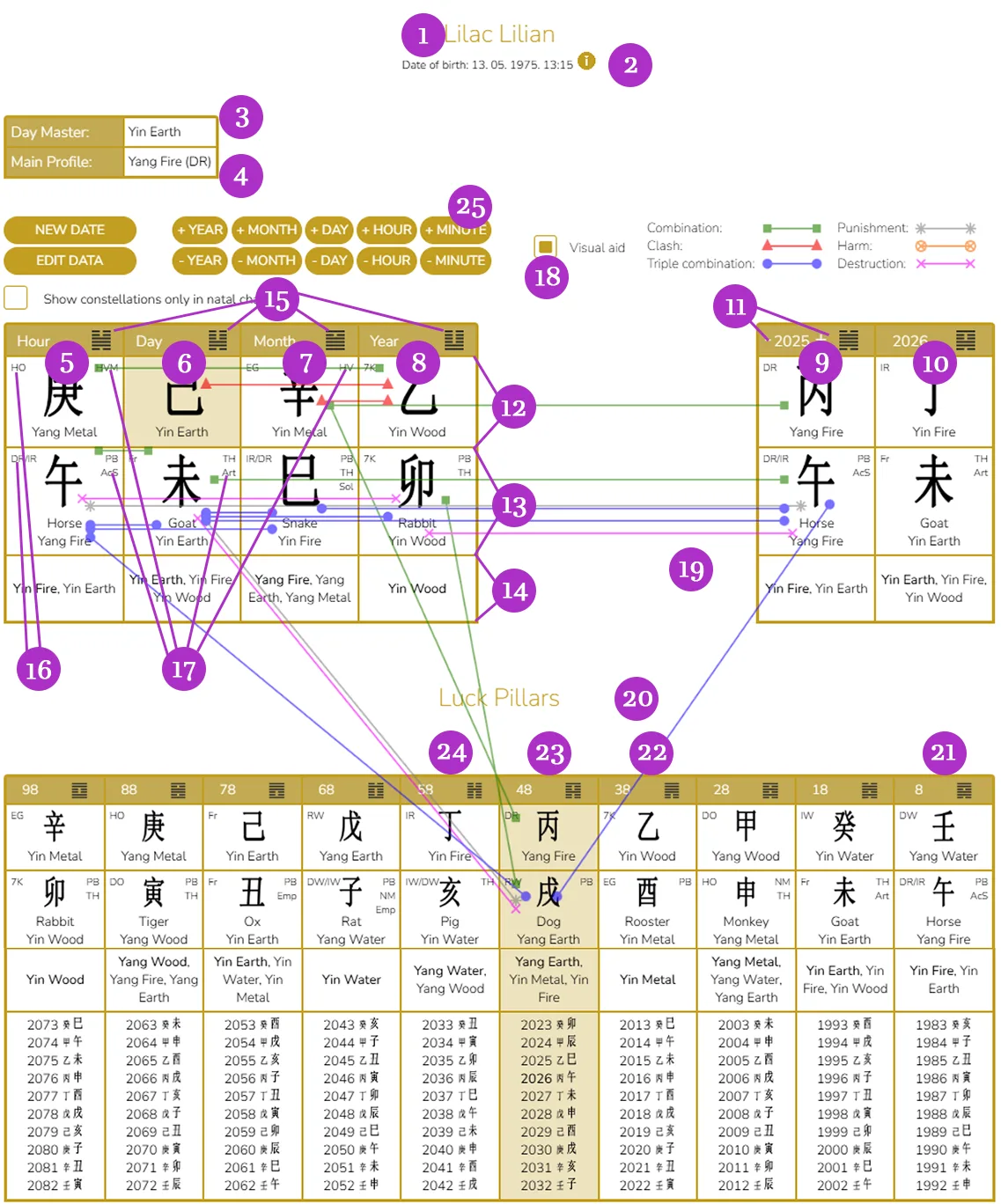 Based on the entered data, unless it is set to check a day’s energies (which has no luck pillar), the calculator shows which current luck pillar a person is living in. This is highlighted in a darker color, and within it you can see which year you are in. The buttons in the top right under “Current Year” allow you to step through additional luck pillars by switching years until the program moves into the next luck pillar. The program always displays the constellation interactions within the currently active highlighted pillar. What does your current luck pillar mean? Learn here: